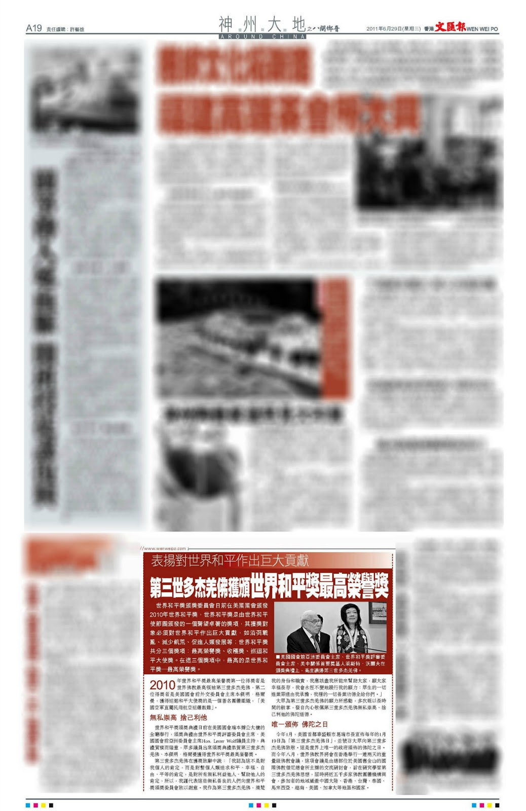「世界和平獎評審委員會」於2011年6月27日 在美國國會金廳舉行了隆重的頒獎儀式,向2010年「世界和平獎最高榮譽獎」得主:世界佛教領袖第三世多杰羌佛、前美國國會「眾議院外交委員會」主席本傑明.格爾曼的致敬。該慶典由「世界和平獎」創辦人韓敏洙 先生主持。蒞臨的嘉賓有多位國會議員及來自世界各地的貴賓。其中包括美國「參議院撥款委員會」委員馬克.可克先生;前國會參議員史蒂夫.司明 先生;「眾議院國際事務委員會」主席綺蓮那.樂斯.雷提寧 女士;「眾議院監督及政府改革委員會」主席達雷爾.以薩先生;「眾議院司法委員會」委員史蒂夫.查博 先生;「眾議院國土安全事務委員會」委員希拉.傑克遜.李 女士;「眾議院交通運輸及鐵路小組委員會」主席的歌蓮.佈朗女士等。他們皆稱讚各獲獎人的卓越成就,為世界和平及教化作出努力,實至名歸。「世界和平獎」多年來持續地表揚為建立及維護和平作出努力的人士。